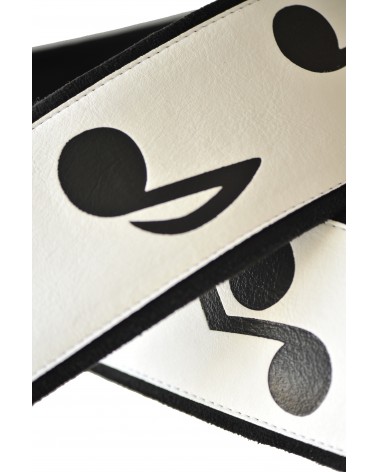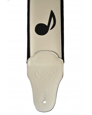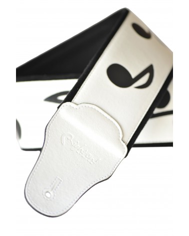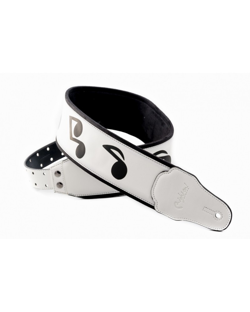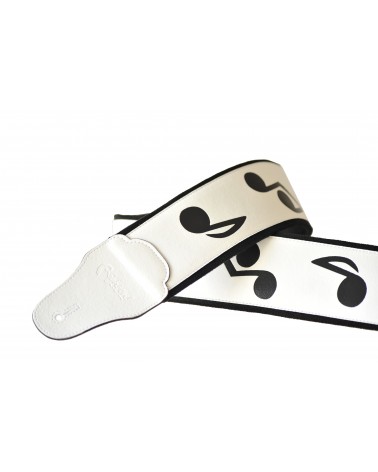 Correa ancha para bajo y guitarra fabricada 100% en España decorada con notas musicales como la que utilizaba Stevie Ray Vaughan SRV. Con sistema de ajuste RAS. Una bandolera que por su anchura resulta muy cómoda en el hombro y para soportar el peso del instrumento.