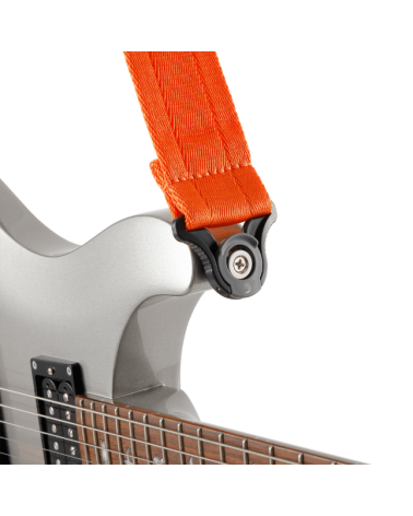 La correa para guitarra con autobloqueo es el sistema de bloqueo de correa integrado más sencillo para su ejecución. Basta con deslizar el extremo de la correa por los enganches de la guitarra y ya está bloqueado. Así de fácil. El cierre gris lleva un muelle, por lo que automáticamente se cierra sobre el enganche de la guitarra y no se soltará hasta que usted quiera. Basta con presionar hacia arriba el cierre gris, sacar el extremo y la correa sale. Funciona con la mayoría de enganches del mercado. La correa para guitarra con autobloqueo se diseñó en colaboración con Ned Steinberger.