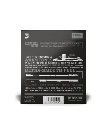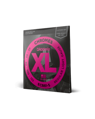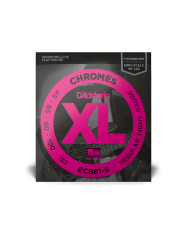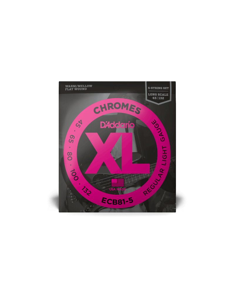 Las ECB81-5, la versión de 5 cuerdas de las cuerdas de entorchado plano para bajo más vendidas de D'Addario, son conocidas por su tono cálido y meloso y su tacto suave pulido. Con la adición de una cuerda B grave de .132, las Chromes ofrecen unos graves profundos y ricos que las convierten en la opción de cuerdas de entorchado plano de músicos de jazz, R&B y pop. Adecuadas para bajos de escala larga con una longitud de escala de hasta 36 1/4"