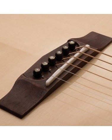 Tapa armónica de abeto. Este tipo de madera, conocido por ser uno de los más populares en la fabricación de guitarras acústicas, posibilita el hecho de utilizar la guitarra en cualquier tipo de género musical debido a su enorme versatilidad.