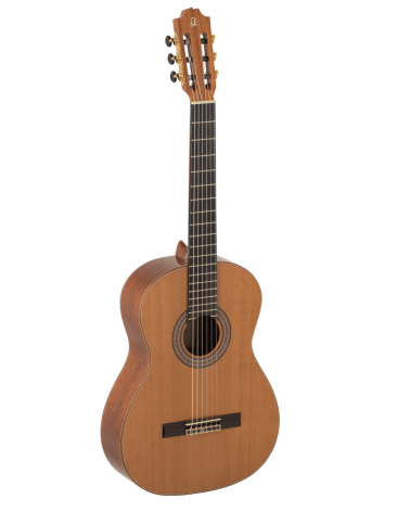 La admira A40 es nuestra guitarra toda maciza. Está fabricada con una selección de maderas, combinando el cedro macizo en la tapa y la caoba también macizo en los aros y fondo. Tiene el brazo de tres piezas con refuerzo de Palisandro lo que le confiere mayor estabilidad a la guitarra y un sonido claro y nítido. La fabricamos también en versión electrificada Fishman.