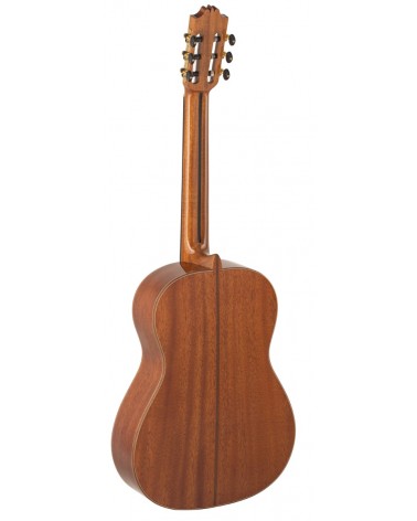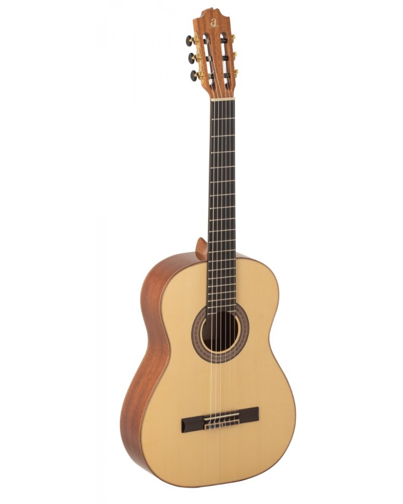 Nuestra guitarra admira A45 es toda maciza de caoba con tapa de Abeto. Está fabricada con una selección de maderas, combinando el abeto macizo en la tapa y la caoba también macizo en los aros y fondo. Tiene el brazo de tres piezas con refuerzo de Palisandro lo que le confiere mayor estabilidad a la guitarra y un sonido claro y nítido. La fabricamos también en versión electrificada Fishman.
