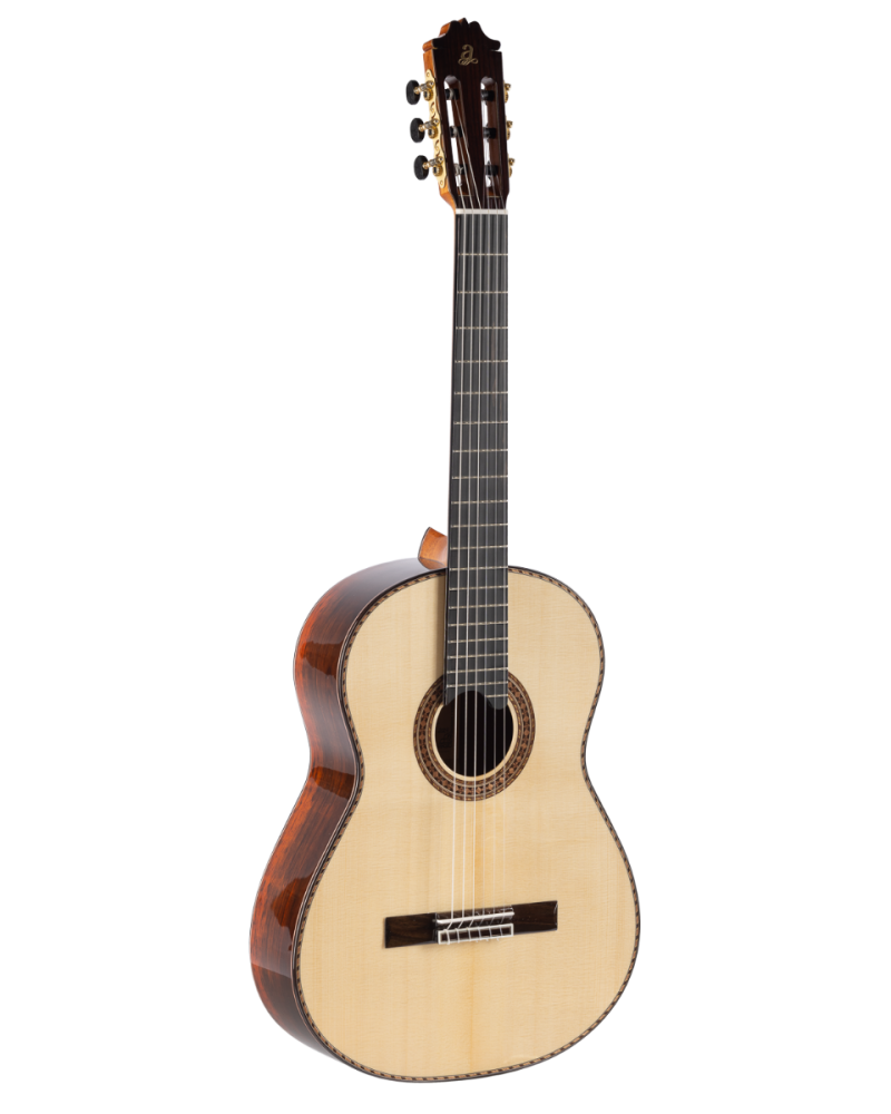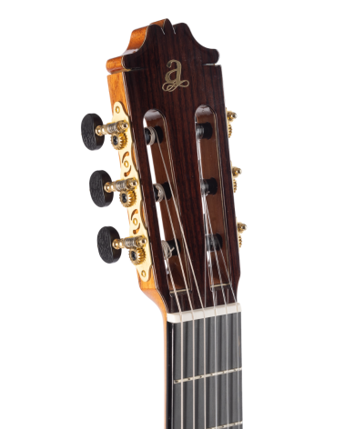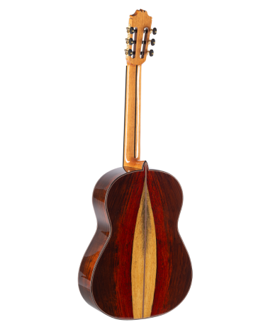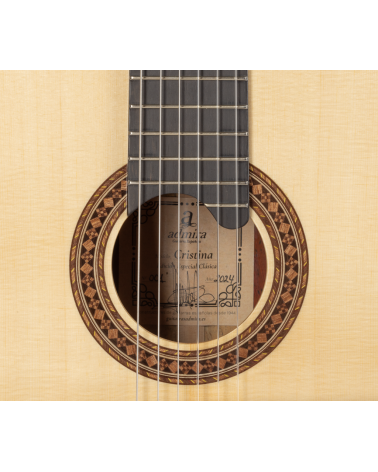 La admira CRISTINA es nuestra mejor guitarra, Suprema. Está fabricada con una selección de maderas, combinando el abeto macizo en la tapa y el cocobolo también macizo en los aros y fondo. Su trabajo artesanal, junto a los detalles en los ribetes, con alma y marquetería hacen de esta guitarra la Suprema de todas las guitarras admira. Tiene el brazo de tres piezas con refuerzo de Palisandro lo que le confiere mayor estabilidad a la guitarra y un sonido claro y nítido.