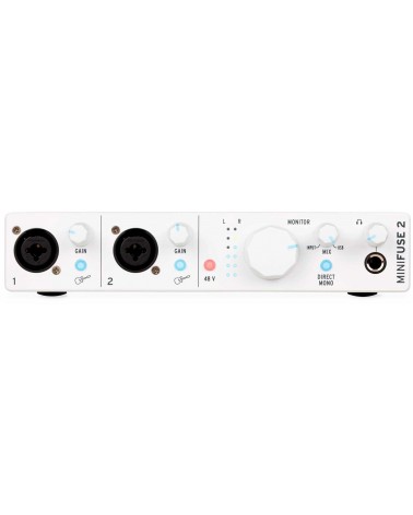 Interfaz USB compacta para grabación de voz, guitarra, sintetizadores y demás. 2 entradas combo Mic/Inst/Line XLR con alimentación phantom de 48V. 2 salidas de línea balanceadas TRS de 1/4" con control de volumen. Salida de auriculares estéreo con control de volumen. Entrada/Salida MIDI de 5 contactos. Concentrador USB2 tipo A (250mA máx.). Canal de loopback virtual estéreo. Interfaz USB-C compatible con PC y Mac, totalmente compatible con USB 2.0- Alimentación por bus. Incluye paquete de software para producción musical: Ableton Live Lite, Analog Lab Intro, suscripciones de prueba de 3 a AUTO-TUNE UNLIMITED™ y SpliceCreator, y plugins de emulaciones de procesadores de estudio:: Pre 1973, RevPLATE-140, Delay TAPE-201 y Chorus JUN-6. Acabado en color blanco.