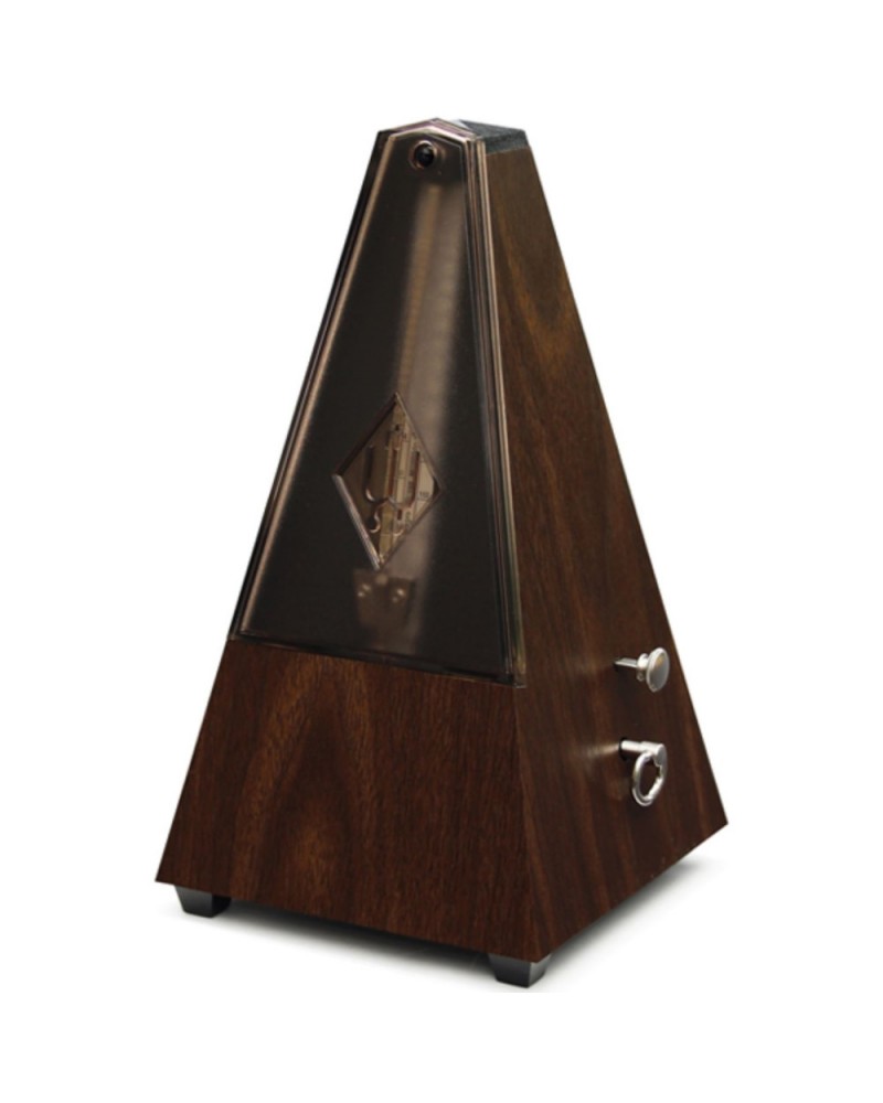 Metrónomo de la marca Wittner con mecanismo de relojería y sistema Malzel. Diseño en Pirámide realizado en carcasa de plástico de color Caoba. Con campara. No necesita pilas. Rango de 40 a 208 bpm.