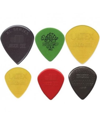 Bolsa de 6 púas variadas tamaños Jazz III. Contiene las siguientes púas: - Nylon Jazz III, Red - Nylon Max Grip Jazz III - Carbon Fiber Nylon Jazz III XL - Black Tortex Jazz M3 - Ultex Jazz III - Ultex Jazz III XL