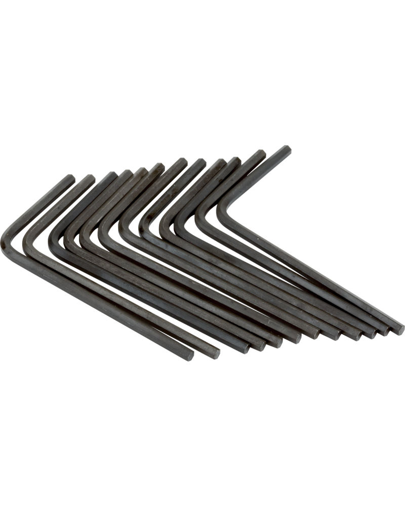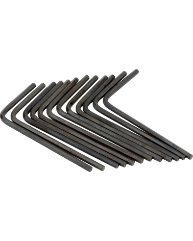 Paquete de doce llaves de ajuste hexagonales (Allen) en forma de L de 1/8". Dimensiones de la llave: 1/8" x 1-1/4" x 2-3/4".
