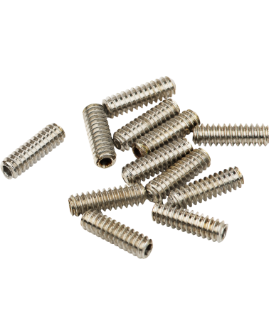 El paquete contiene doce tornillos de fijación hexagonales niquelados (6-32 x 7/16"). Se utilizan para ajustar la altura de la cejuela en bajos American Special (EE. UU.) y Standard Series (México).