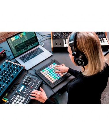 Controlador de cuadrícula para Ableton Live. La integración total con Ableton. 64 grandes pads RGB supersensibles a la presión y la velocidad de pulsación, que reflejan perfectamente de tu sesión de Ableton Live. Potente secuenciador de 4 pistas y 32 pasos, con 8 motas de polifonía, encadenamiento de patrones y escenas y controles de probabilidad y mutación. Modo de acordes y modos dinámicos de Nota y Escala para interpretar sin esfuerzo líneas de bajo, melodías, acordes y partes solistas perfectamente a tono. Carga automática de racks de batería en la cuadrícula. MIDI In, Out y Thru. Acceso desde la unidad a la función Capturar MIDI de Ableton Live. 8 modos personalizados usando Novation Components. Elegante, ligero y resistente y alimentado por USB-C. Herramienta de puesta en marcha fácil y video guías paso-a-paso para empezar a hacer música en cuestión de minutos. Garantía Novation de 2 años. Incluye Ableton Live Lite, dos meses de membresía a Splice Sounds, Pack de sintes virtuales AAS Session, teclado virtual de XLN Addictive Keys, plugins de efectos R0Verb y DAW Cassette de Klevgrand, pack de plugins Time and Tone de Softube y acceso a la plataforma Sound Collective.